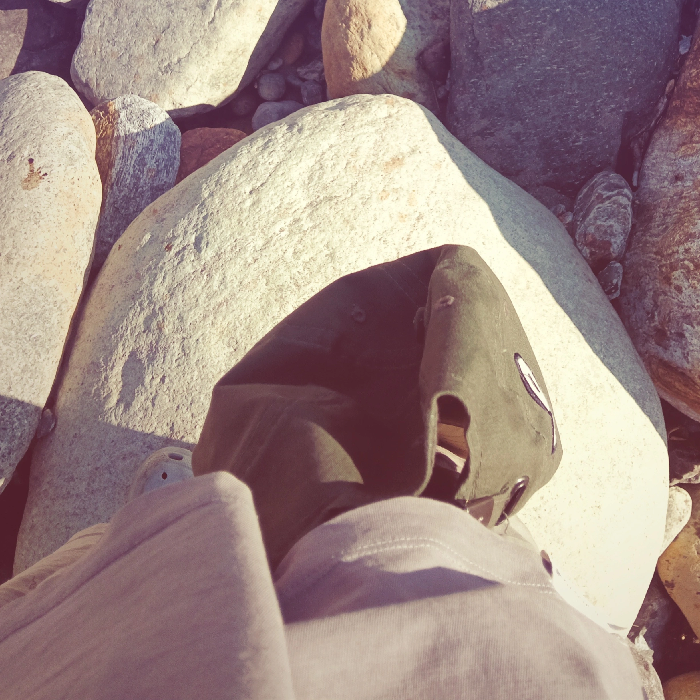 "A realistic, high-quality travel photograph of a young man and a young woman standing together on a large, flat river stone in the middle of a shallow, rocky river. The man (matching the original image) is leaning back slightly with his arms crossed, wearing a grey t-shirt, beige shorts, and a backwards olive green cap. Beside him, the young woman has a natural look with long dark hair left loose and no headband or hair accessories. She is wearing a cream t-shirt under an olive green utility vest and black athletic running shorts. She is barefoot, with no watch or jewelry. The background features a wide bed of smooth river stones, clear flowing water, and hazy, layered blue mountains under soft, natural daylight. The image has a slightly desaturated, vintage film aesthetic to match the original photo's tone."